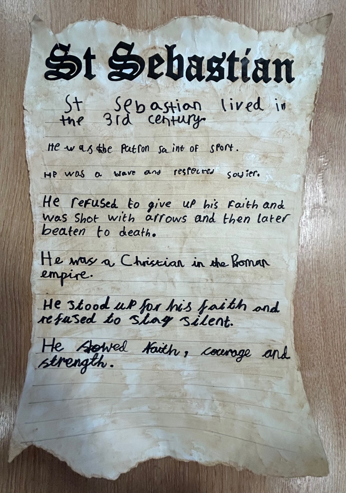 - Year 3 presented a fact scroll, showing what they had learnt about the life of St Sebastian and the importance of knowing our faith.