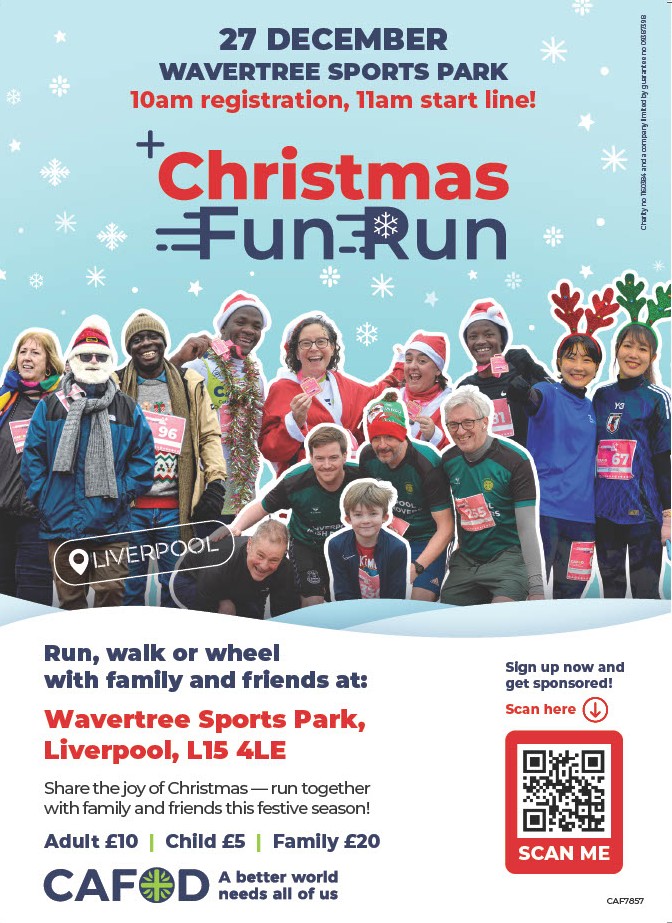 All are welcome at CAFOD’s annual Christmas Fun Run at Wavertree Sports Park, L15 4LE on Saturday 27 December 2025. Registration open from 10am, and the run sets off at 11am. 3k and 5k route options available, pram friendly route and dogs on leads are welcome too. Festive attire is encouraged! We’d love to raise more sponsorship from this event. For a sponsor form or interest in volunteering at the event, please email Colette on cbyrne@cafod.org.uk or sign up now by visiting cafod.org.uk/christmasfunrun