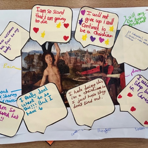 - Year 5 reflected on the thoughts and feelings of those who witnessed St Sebastian’s life, reminding us that living out our faith can inspire others, even in challenging times.