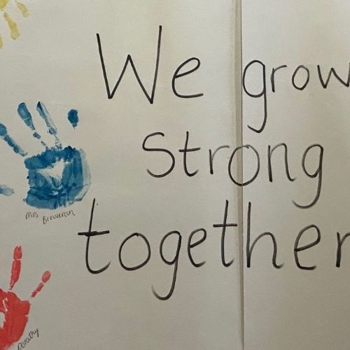 - Our EYFS children created a colourful handprints banner focused on growing strong together. The handprints reminded us that we are all created by God and that even the smallest hands are valued and loved within his family.
