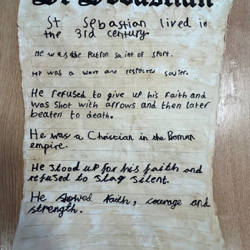 - Year 3 presented a fact scroll, showing what they had learnt about the life of St Sebastian and the importance of knowing our faith.